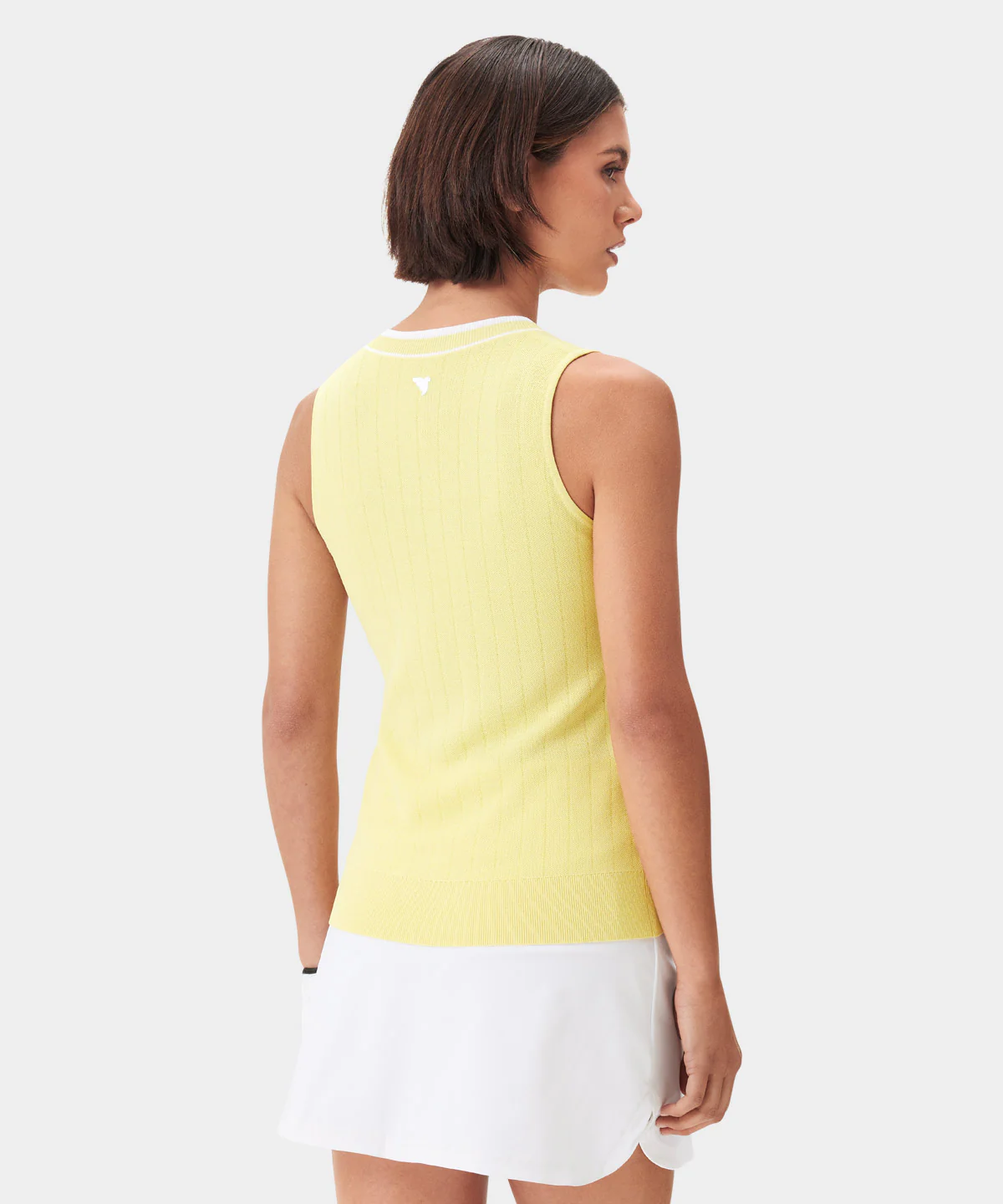 A sleeveless knit v-neck with a crisp rib structure and clean, shaped armholes. The viscose blend feels smooth and cool to the touch while keeping a refined, feminine line. A polished option for warm days when you still want a styled, premium look.
