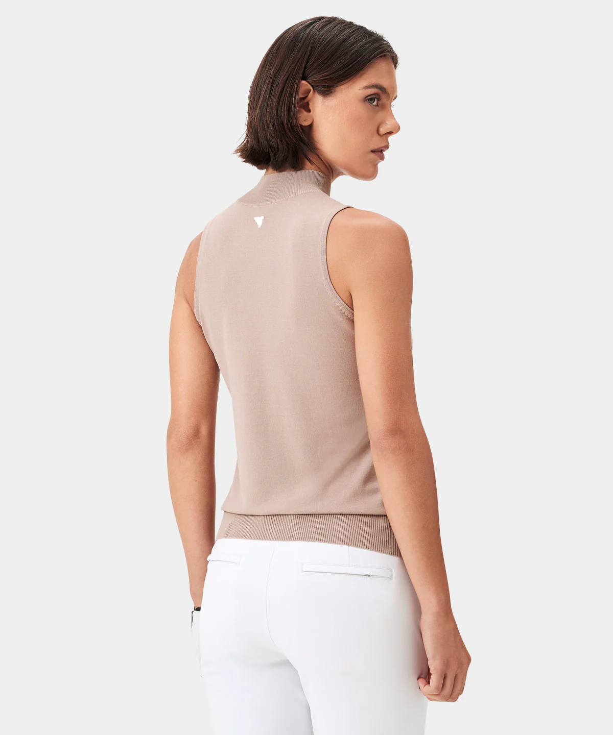 This sleeveless piece is inspired by the retro mock neck design. Made from stretch-jersey with an ample amount of cotton and modal, this top has a sporty high mock neck, slim fit and flattering ribbed hem finish.